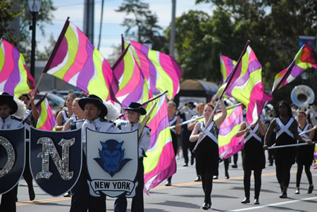 Led by grand marshal Jack Abrams, a retired Huntington School District principal and the district's founding School Heritage Museum curator, the parade stepped off at E. 15th street and continued down New York Avenue to the fairgrounds set-up in the commuter parking lot located between Railroad and Church streets. The Blue Devil marching band performed in the festive procession, producing booming and impressive sounds along the route.