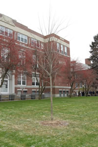 The monument is about 25 feet from where it was originally placed after being purchased by high school students. It was during a 1944 Arbor Day memorial tribute, which saw the entire student body assemble outside the school, that an elm tree was planted in Mr. Campbell’s honor. On that day his mother sat at a desk, mere steps away from the planting site. It was said she never recovered emotionally from his death.