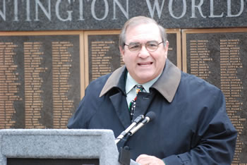 The memorial monument now sits adjacent to the World War II Wall of Remembrance in Veteran’s Plaza on the front lawn of Town Hall. The site served for generations as Huntington High School, before the school district sold the property. Huntington Supervisor Frank P. Petrone called the memorial’s new location “our place for heroes.”