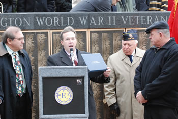 Robert Corwin, who attended the original ceremony as a high school student, was present at the Pearl Harbor Day tribute at town hall last week. “I left Huntington High School to serve in World War II, but came back to get my diploma after being injured at Guadalcanal,” Mr. Corwin said. “I remember Don well. We lived a few streets away from each other.”