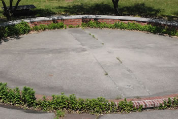 “The circle was to have been scored with a Y shaped design,” said Mr. DiGiacomo, a 1941 Huntington High School graduate, about the concrete area located between seating for the audience and a semi-circular raised barrier ring on which performers could sit. “I was there when the mason who was scoring the concrete ran the center line all the way through,” the architect explained. “What else could I do except to say ‘OK install the rest of the Y.’ which made it a PEACE sign. I was hoping that no one would comment on it and no one did.” Now everyone interested in the history of the Huntington School District knows about it.
