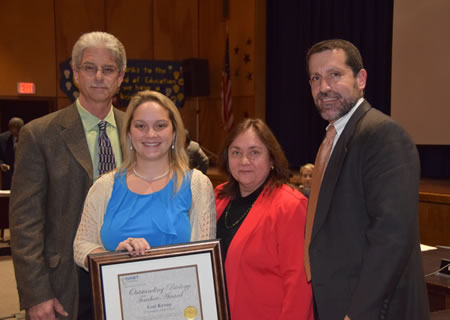 The Outstanding Biology Teacher Award was formally presented to Mrs. Kenny during a short ceremony at the Huntington School Board’s public meeting on Monday night in the Jack Abrams STEM School auditorium.