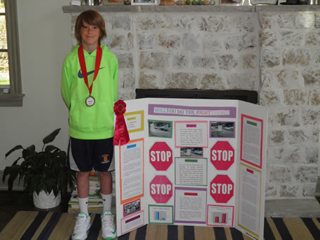 Cole Pillion earned third place after proving people change their behavior when they know they’re being watched in a project titled “Will You Do the Right Thing?” The youngster positioned himself so he was visible to cars approaching a stop sign and also hid from cars, but noted their adherence to traffic law. Mr. Pillion’s results showed beyond a shadow of a doubt that people overwhelmingly do the right thing when being observed.