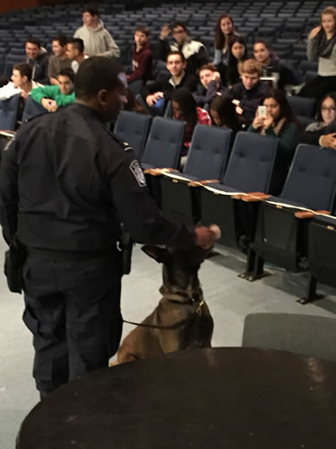It isn’t every day that a United States Customs and Border Protection K-9 unit visits Huntington High School. A pair of officers recently met in the auditorium with criminal justice and personal law students.