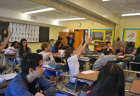 A group of six to eight students performed the rap by improvising and adding lyrics to the refrain. Class members could be seen dancing, tapping, beat boxing and generally having a blast. Some classes performed their rap in both English and Spanish.