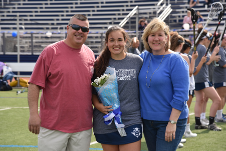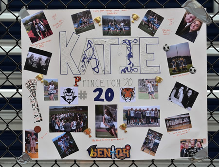 The seniors and their parents walked to midfield under a canopy of lacrosse sticks held in the air by players standing in parallel lines. Blue and white balloons were tied to the railing across the front row of bleachers. Individual posters filled with photos commemorating the career of each senior were on display.