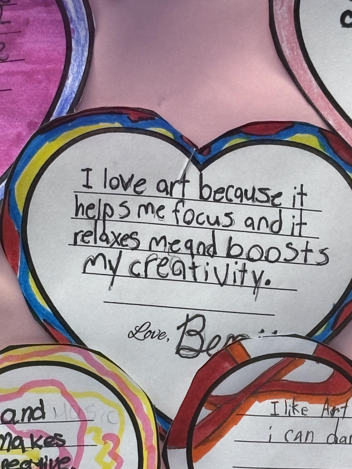 Students have written insightful sentences such as “Art makes me calm” and “Music helps me study.”